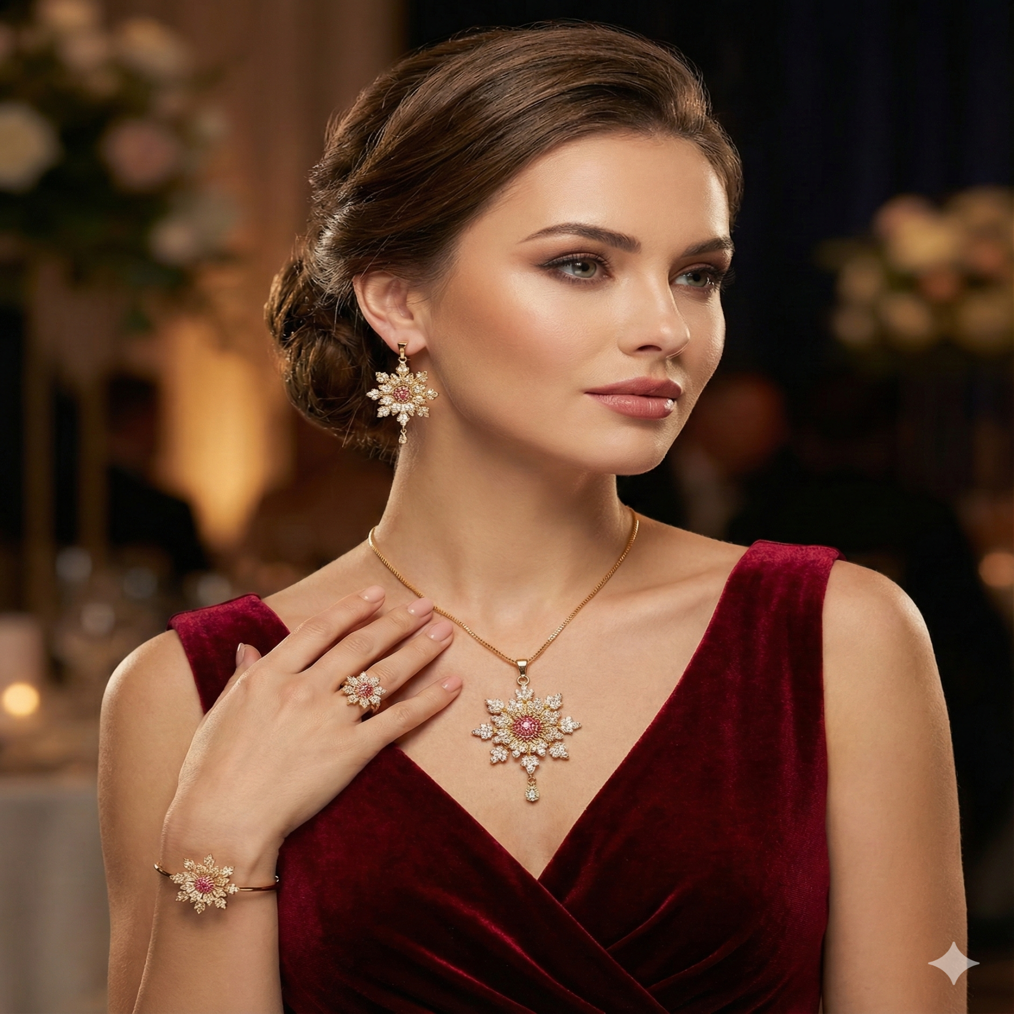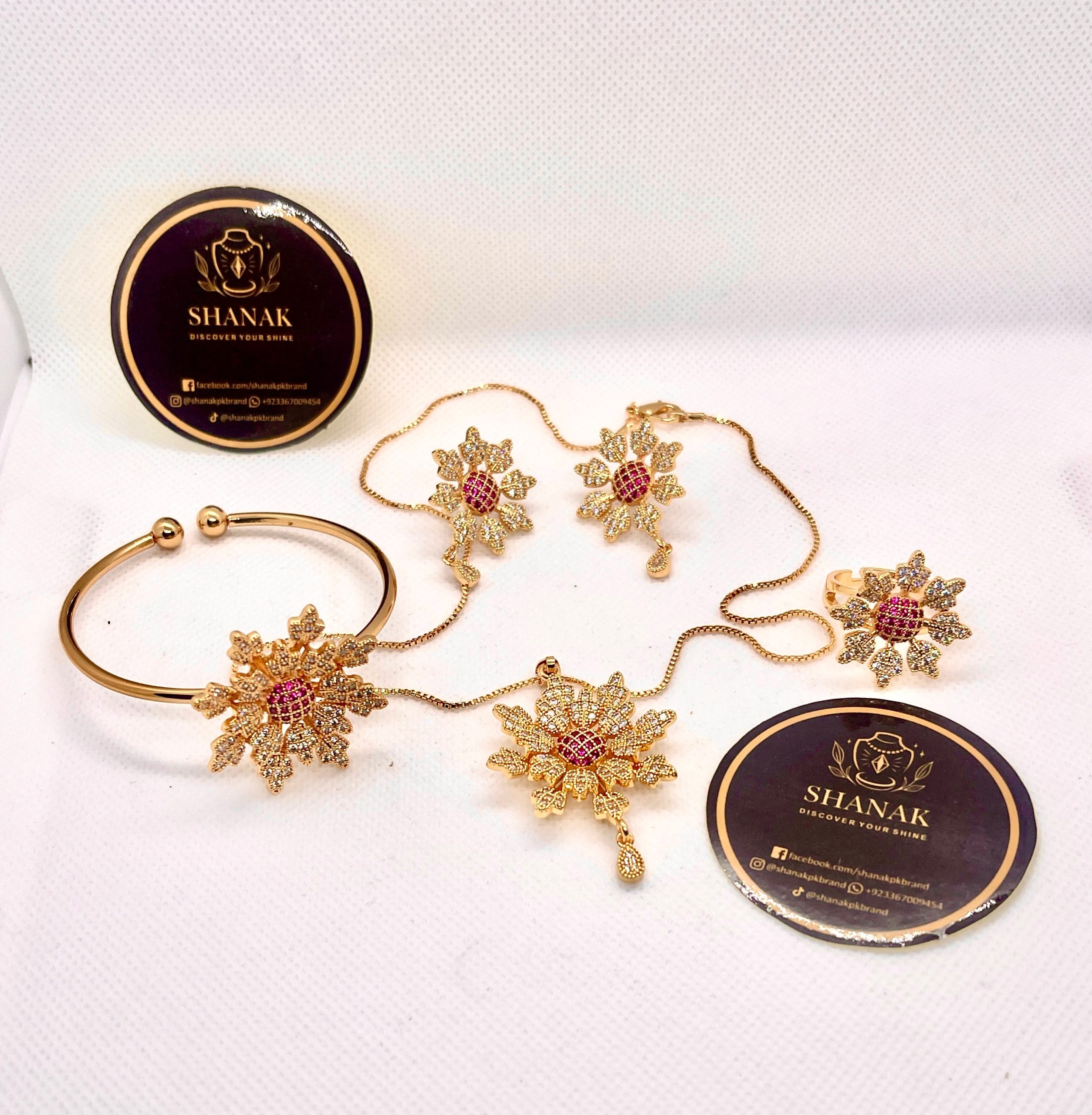 Elevate your elegance with the Shanak Royal Bloom Jewellery Set, a masterpiece inspired by timeless floral beauty. Crafted in radiant gold-plated finish and adorned with dazzling ruby tone centre stones and shimmering crystals, this set reflects luxury in every detail.